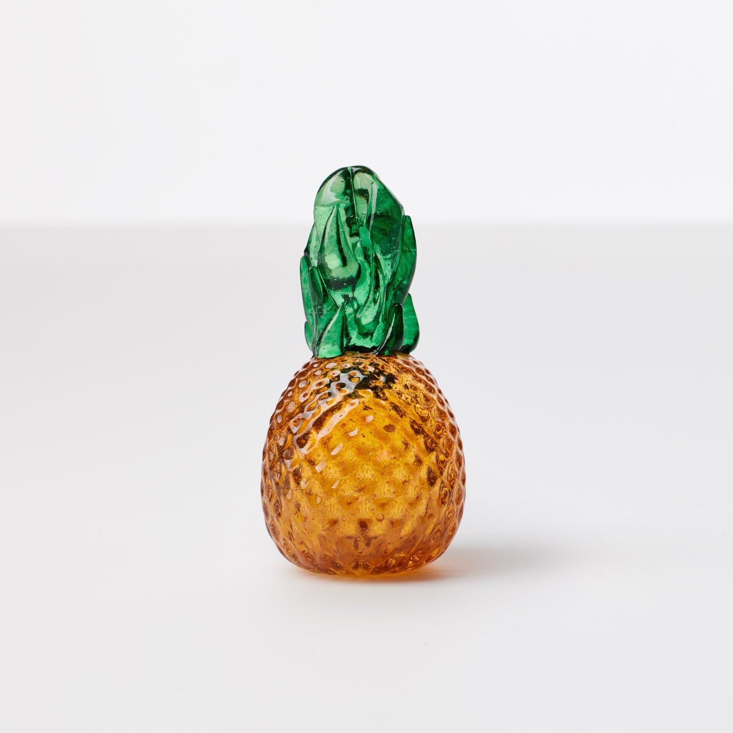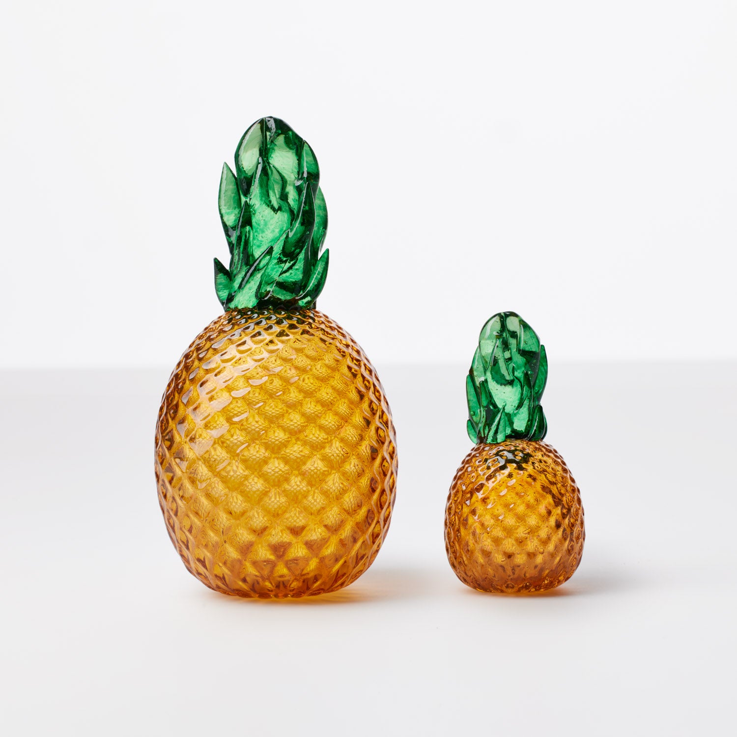 Bring the spirit of Aloha into your home with our blown glass Pineapple! Inspired by Tate's childhood growing up on the North Shore of O'ahu and our shared love of glass, we have worked hard to perfect this design. Each pineapple is hand-blown by our two person team in Philadelphia, PA and features a blown glass body and solid green top.